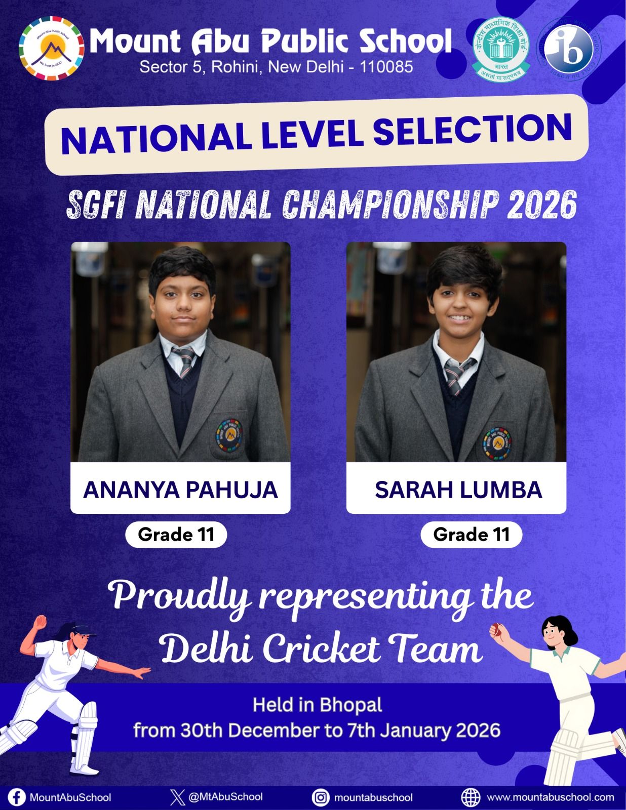 The School is proud to announce the national-level selection of its learners for the SGFI National Championship 2026. Ananya Pahuja and Sarah Lumba of Grade 11 have earned the honour of representing the Delhi Cricket Team, showcasing their talent, perseverance, and commitment to excellence in sports. The SGFI National Championship 2026 will be held in Bhopal from 30th December 2025 to 7th January 2026, featuring outstanding young athletes from across the nation. This achievement is a moment of pride for the entire school community.